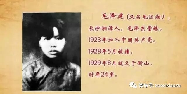 毛泽建,毛泽东堂妹。这个小名叫菊妹子的姑娘,从小过继给毛泽东的父母做女儿。1921年随毛泽东到长沙,加入青年团。1923年加入中国共产党。马日事变后,参加领导南岳暴动,后转移至耒阳坚持游击战争。